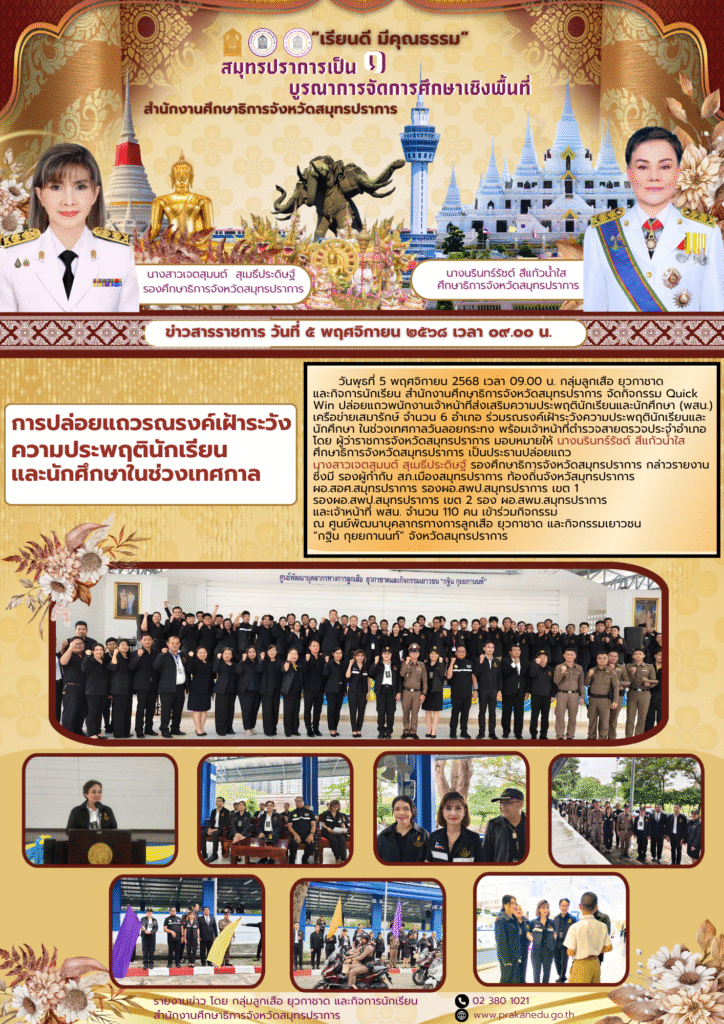 วันพุธที่ 5 พฤศจิกายน 2568 เวลา 09.00 น. กลุ่มลูกเสือ ยุวกาชาดและกิจการนักเรียน สำนักงานศึกษาธิการจังหวัดสมุทรปราการ จัดกิจกรรม Quick Win ปล่อยแถวพนักงานเจ้าหน้าที่ส่งเสริมความประพฤตินักเรียนและนักศึกษา (พสน.) เครือข่ายเสมารักษ์ จำนวน 6 อำเภอ ร่วมรณรงค์เฝ้าระวังความประพฤตินักเรียนและนักศึกษา ในช่วงเทศกาลวันลอยกระทง พร้อมเจ้าหน้าที่ตำรวจสายตรวจประจำอำเภอ โดยมี นางนรินทร์รัชต์ สีแก้วน้ำใส ศึกษาธิการจังหวัดสมุทรปราการ เป็นประธาน นางสาวเจตสุมนต์ สุเมธีประดิษฐ์ รองศึกษาธิการจังหวัดสมุทรปราการ กล่าวรายงาน ซึ่งมี รองผู้กำกับ สภ.เมืองสมุทรปราการ ท้องถิ่นจังหวัดสมุทรปราการ ผอ.สอศ.สมุทรปราการ รองผอ.สพป.สมุทรปราการ เขต 1 รองผอ.สพป.สมุทรปราการ เขต 2 รอง ผอ.สพม.สมุทรปราการ ผอ.สอจ.สมุทรปราการ และเจ้าหน้าที่ พสน. จำนวน 110 คน เข้าร่วมกิจกรรม ณ ศูนย์พัฒนาบุคลากรทางการลูกเสือ ยุวกาชาด และกิจกรรมเยาวชน “กฐิน กุยยกานนท์” จังหวัดสมุทรปราการ