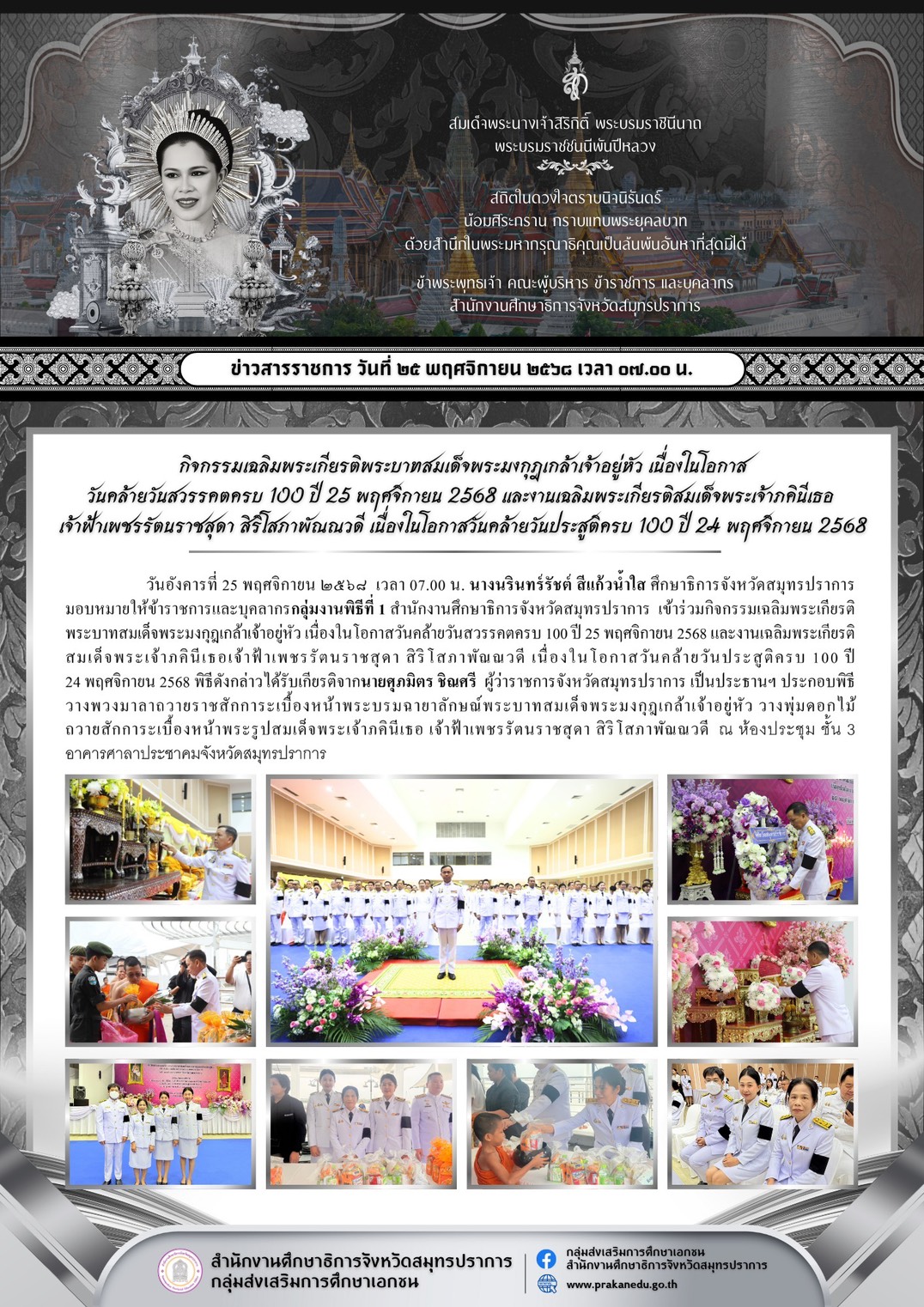 วันอังคารที่ 25 พฤศจิกายน ๒๕๖๘ เวลา 07.00 น. นางนรินทร์รัชต์ สีแก้วน้ำใส ศึกษาธิการจังหวัดสมุทรปราการ มอบหมายให้ข้าราชการและบุคลากรกลุ่มงานพิธีที่ 1 สำนักงานศึกษาธิการจังหวัดสมุทรปราการ เข้าร่วมกิจกรรมเฉลิมพระเกียรติพระบาทสมเด็จพระมงกุฎเกล้าเจ้าอยู่หัว เนื่องในโอกาสวันคล้ายวันสวรรคตครบ 100 ปี 25 พฤศจิกายน 2568 และงานเฉลิมพระเกียรติสมเด็จพระเจ้าภคินีเธอเจ้าฟ้าเพชรรัตนราชสุดา สิริโสภาพัณณวดี เนื่องในโอกาสวันคล้ายวันประสูติครบ 100 ปี 24 พฤศจิกายน 2568 พิธีดังกล่าวได้รับเกียรติจากนายศุภมิตร ชิณศรี ผู้ว่าราชการจังหวัดสมุทรปราการ เป็นประธานฯ ประกอบพิธี วางพวงมาลาถวายราชสักการะเบื้องหน้าพระบรมฉายาลักษณ์พระบาทสมเด็จพระมงกุฎเกล้าเจ้าอยู่หัว วางพุ่มดอกไม้ ถวายสักการะเบื้องหน้าพระรูปสมเด็จพระเจ้าภคินีเธอ เจ้าฟ้าเพชรรัตนราชสุดา สิริโสภาพัณณวดี ณ ห้องประชุม ชั้น 3 อาคารศาลาประชาคมจังหวัดสมุทรปราการ