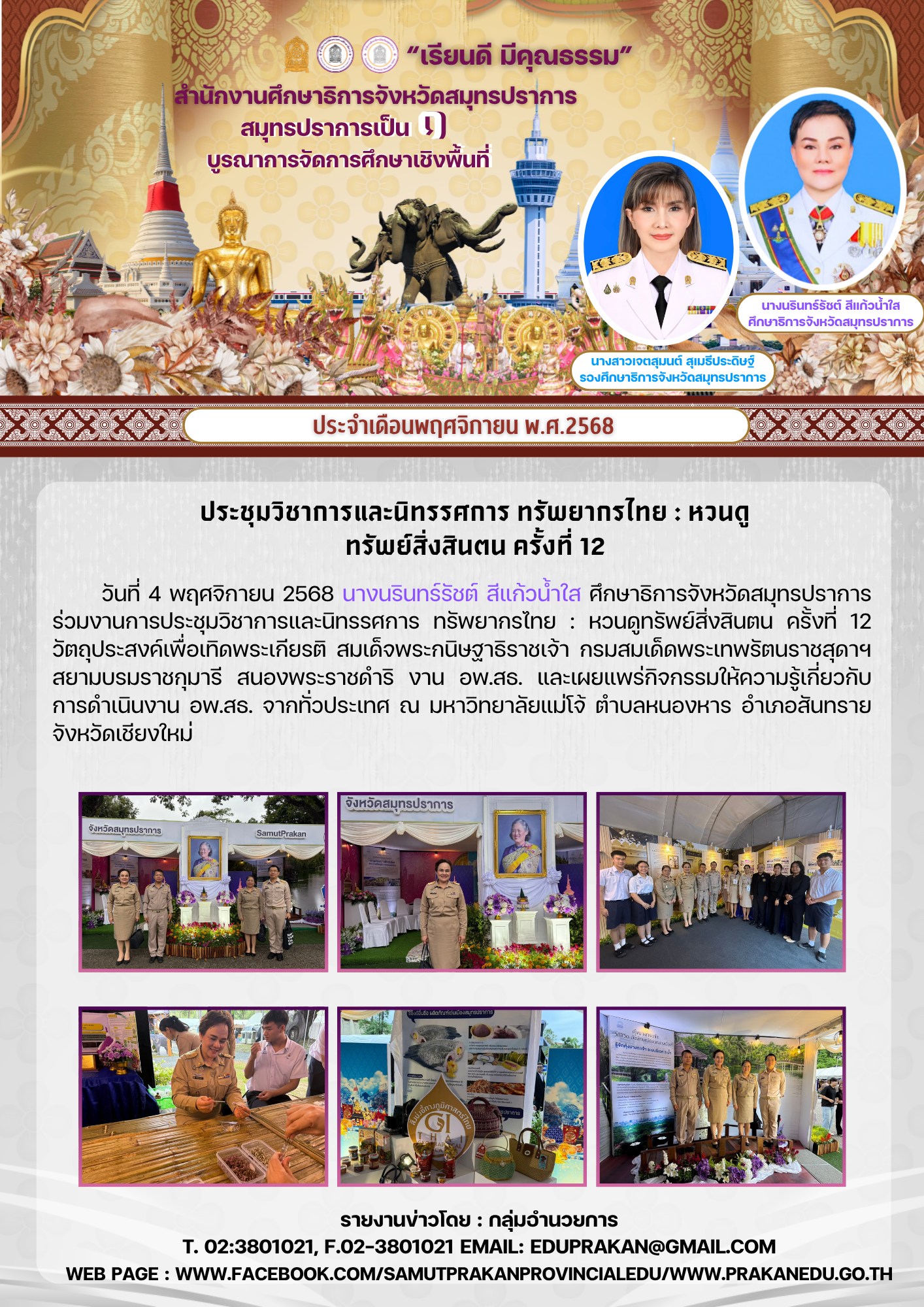 วันที่ 4 พฤศจิกายน 2568 นางนรินทร์รัชต์ สีแก้วน้ำใส ศึกษาธิการจังหวัดสมุทรปราการ ร่วมงานการประชุมวิชาการและนิทรรศการ ทรัพยากรไทย : หวนดูทรัพย์สิ่งสินตน ครั้งที่ 12 วัตถุประสงค์เพื่อเทิดพระเกียรติ สมเด็จพระกนิษฐาธิราชเจ้า กรมสมเด็ดพระเทพรัตนราชสุดาฯ สยามบรมราชกุมารี สนองพระราชดำริ งาน อพ.สธ. และเผยแพร่กิจกรรมให้ความรู้เกี่ยวกับการดำเนินงาน อพ.สธ. จากทั่วประเทศ ณ มหาวิทยาลัยแม่โจ้ ตำบลหนองหาร อำเภอสันทราย จังหวัดเชียงใหม่