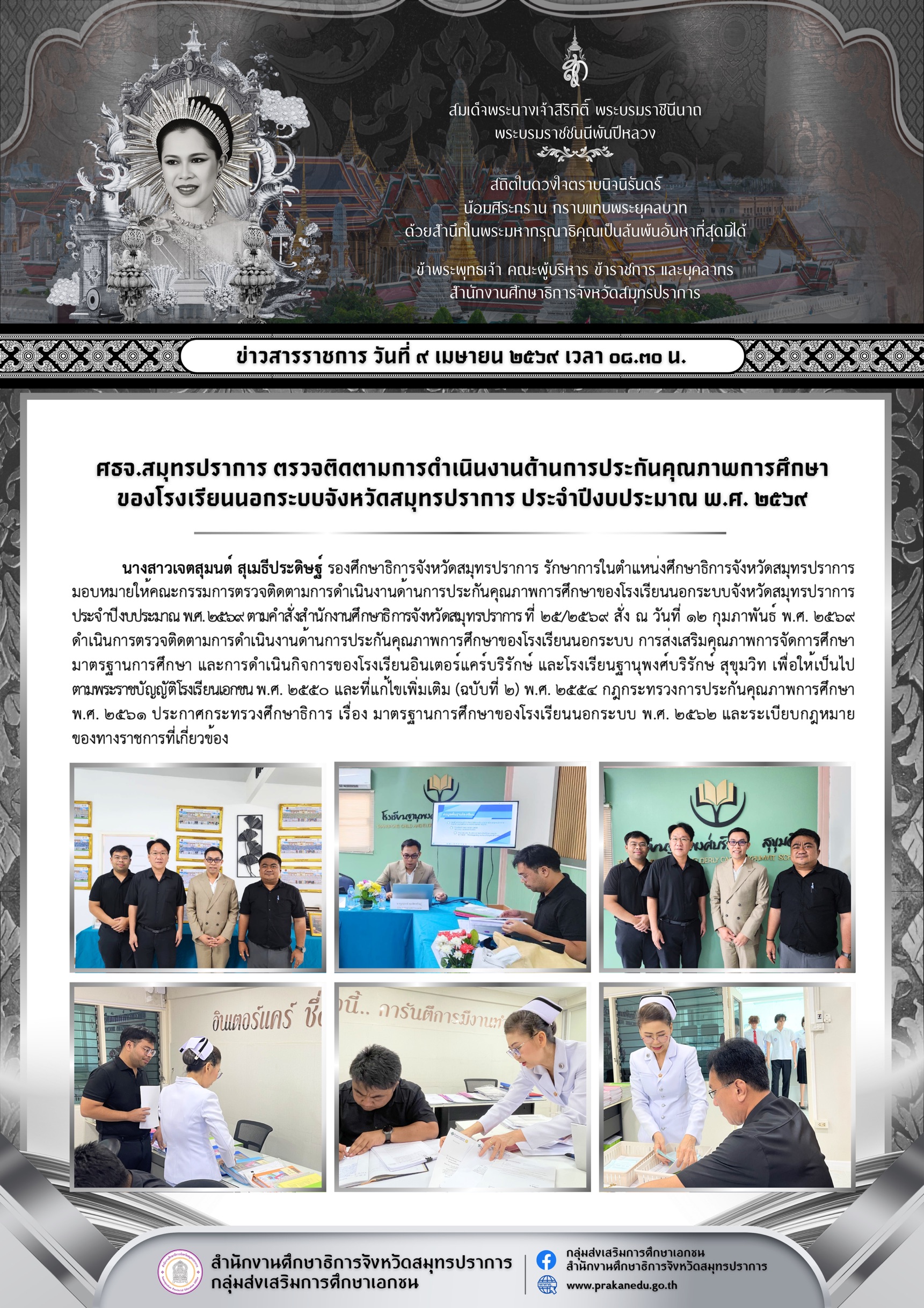 💠นางสาวเจตสุมนต์ สุเมธีประดิษฐ์ รองศึกษาธิการจังหวัดสมุทรปราการ รักษาการในตำแหน่งศึกษาธิการจังหวัดสมุทรปราการ มอบหมายให้คณะกรรมการตรวจติดตามการดำเนินงานด้านการประกันคุณภาพการศึกษาของโรงเรียนนอกระบบจังหวัดสมุทรปราการ ประจำปีงบประมาณ พ.ศ. ๒๕๖๙ ตามคำสั่งสำนักงานศึกษาธิการจังหวัดสมุทรปราการ ที่ ๒๕/๒๕๖๙ สั่ง ณ วันที่ ๑๒ กุมภาพันธ์ พ.ศ. ๒๕๖๙ ดำเนินการตรวจติดตามการดำเนินงานด้านการประกันคุณภาพการศึกษาของโรงเรียนนอกระบบ การส่งเสริมคุณภาพการจัดการศึกษา มาตรฐานการศึกษา และการดำเนินกิจการของโรงเรียนอินเตอร์แคร์บริรักษ์ และโรงเรียนฐานุพงศ์บริรักษ์ สุขุมวิท เพื่อให้เป็นไป ตามพระราชบัญญัติโรงเรียนเอกชน พ.ศ. ๒๕๕๐ และที่แก้ไขเพิ่มเติม (ฉบับที่ ๒) พ.ศ. ๒๕๕๔ กฎกระทรวงการประกันคุณภาพการศึกษา พ.ศ. ๒๕๖๑ ประกาศกระทรวงศึกษาธิการ เรื่อง มาตรฐานการศึกษาของโรงเรียนนอกระบบ พ.ศ. ๒๕๖๒ และระเบียบกฎหมายของทางราชการที่เกี่ยวข้อง💠