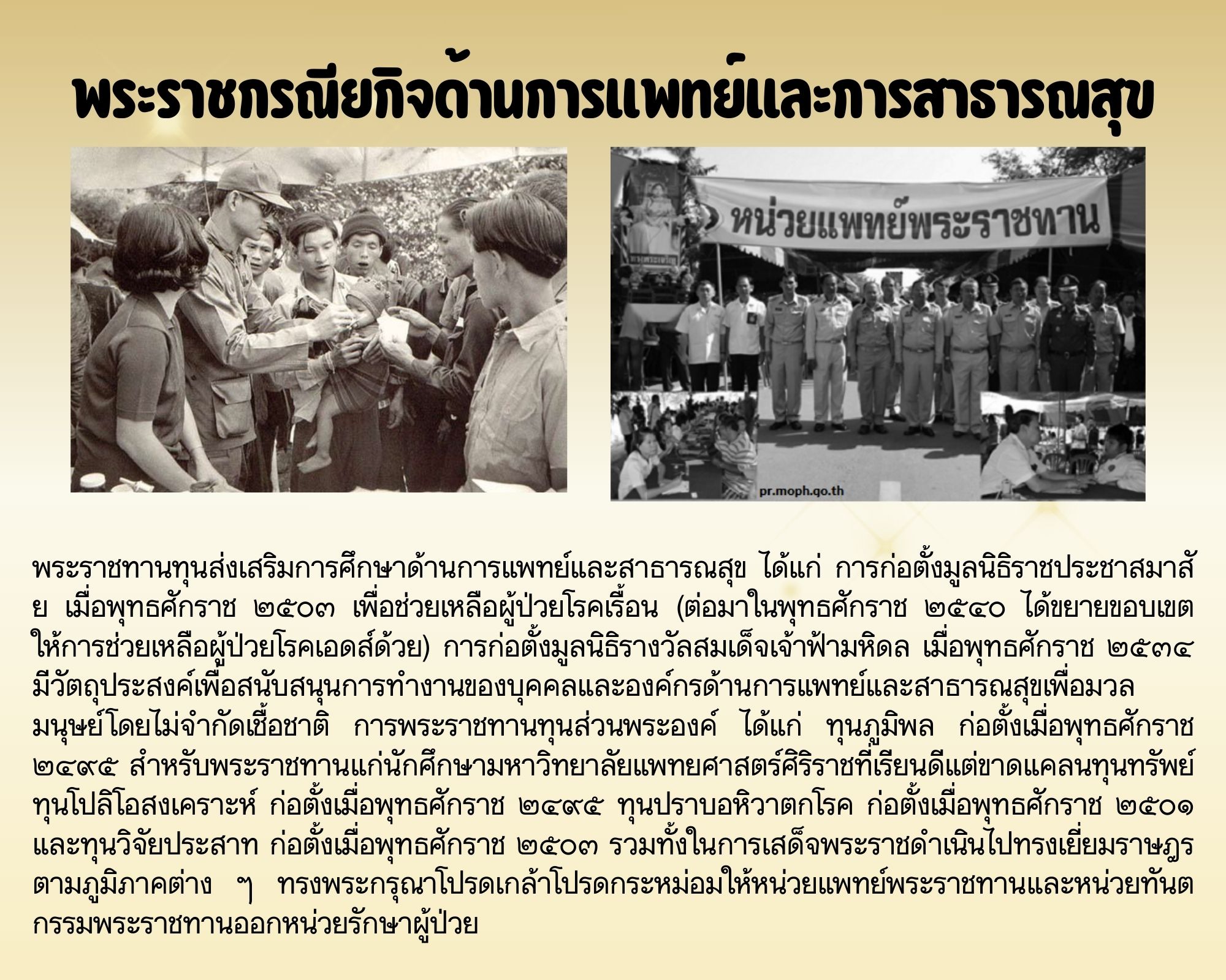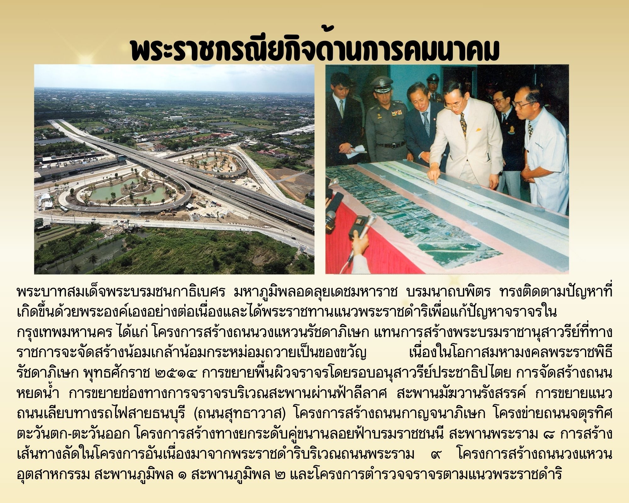 ตลอดระยะเวลา 70 ปี แห่งรัชสมัยพระบาทสมเด็จพระบรมชนกาธิเบศร มหาภูมิพลอดุลยเดชมหาราช บรมนาถบพิตร ทรงปกครองอาณาประชาราษฎร์ด้วยทศพิธราชธรรม และทรงบำเพ็ญพระราชกรณียกิจเป็นอเนกประการ เพื่อวางรากฐานการพัฒนาประเทศให้มีความเจริญก้าวหน้าอย่างมั่นคง ทรงเป็นพระมหากษัตริย์นักพัฒนา และเป็นศูนย์รวมจิตใจของคนในชาติ ปวงพสกนิกรใต้ร่มพระบารมีทั่วราชอาณาจักร ต่างประจักษ์ในพระมหากรุณาธิคุณและพระเมตตา ที่ได้ทรงทุ่มเทกำลังพระวรกายและกำลังพระสติปัญญาปฏิบัติพระราชกรณียกิจนานัปการ เพื่อประโยชน์สุขแห่งปวงพสกนิกร โครงการในพระราชดำริน้อยใหญ่ ก่อให้เกิดประโยชน์อย่างอเนกอนันต์แก่ประเทศชาติ ทั้งได้พระราชทานหลักปรัชญาของเศรษฐกิจพอเพียง เพื่อเป็นแนวทางให้อาณาประชาราษฎร์ได้ดำเนินชีวิตโดยใช้ความรู้และสติปัญญาเป็นภูมิคุ้มกัน อีกทั้งยังก่อให้เกิดประโยซน์แก่ประชาชนของประเทศต่าง ๆ ที่ได้น้อมนำแนวทางพระราชทานไปปฏิบัติ พระเกียรติคุณแผ่ไพศาลขจรขจายไปทั่วทิศานุทิศ ด้วยพระมหากรุณาธิคุณอันล้นพ้น พระองค์จึงสถิตอยู่ในดวงใจของทวยราษฎร์ตลอดมา ทรงเป็นมิ่งขวัญ เป็นกำลังใจ และกำลังศรัทธาของชาวไทยทุกหมู่เหล่า ด้วยสำนึกในพระมหากรุณาธิคุณอันหาที่สุดมิได้ข้าพระพุทธเจ้าทั้งหลาย จักขอสืบสานพระราชปณิธานด้วยความจงรักภักดี จะยึดมั่นในการปฏิบัติดี เพื่อรักษาชาติ บ้านเมือง และสร้างสรรค์คุณประโยชน์แก่ประเทศชาติและประชาชนสืบไป