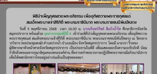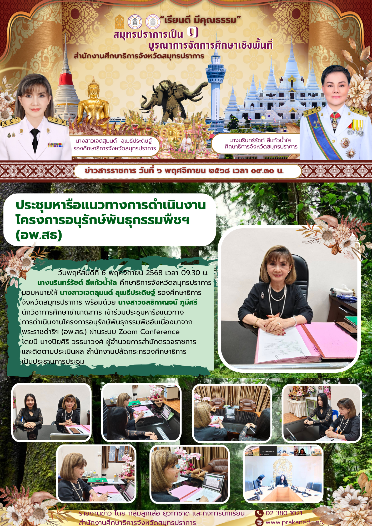 นางนรินทร์รัชต์ สีแก้วน้ำใส ศึกษาธิการจังหวัดสมุทรปราการ มอบหมายให้ นางสาวเจตสุมนต์ สุเมธีประดิษฐ์ รองศึกษาธิการจังหวัดสมุทรปราการ พร้อมด้วย นางสาวชลธิกาญจน์ ภูมีศรี นักวิชาการศึกษาชำนาญการ เข้าร่วมประชุมหารือแนวทางการดำเนินงานโครงการอนุรักษ์พันธุกรรมพืชอันเนื่องมาจากพระราชดำริฯ (อพ.สธ.) ผ่านระบบ Zoom Conference โดยมี นางปิยศิริ วรธนาวงศ์ ผู้อำนวยการสำนักตรวจราชการและติดตามประเมินผล สำนักงานปลัดกระทรวงศึกษาธิการ เป็นประธานการประชุม