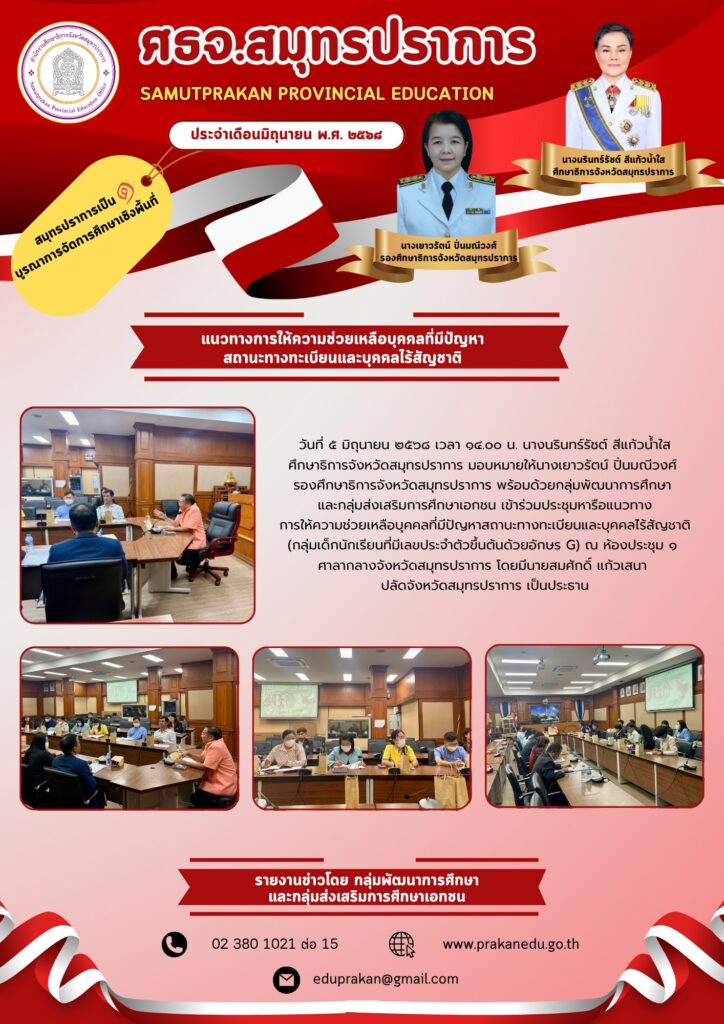 วันที่ 5 มิถุนายน 2568 นางนรินทร์รัชต์ สีแก้วน้ำใส ศึกษาธิการจังหวัดสมุทรปราการ มอบหมายให้นางเยาวรัตน์ ปิ่นมณีวงศ์ รองศึกษาธิการจังหวัดสมุทรปราการ พร้อมด้วย กลุ่มพัฒนาการศึกษา และกลุ่มส่งเสริมการศึกษาเอกชน เข้าร่วมการประชุมหารือแนวทางการให้ความช่วยเหลือบุคคลที่มีปัญหาสถานะทางทะเบียนและบุคคลไร้สัญชาติ (กลุ่มเด็กนักเรียนที่มีเลขประจำตัวขึ้นต้นด้วยอักษร G)