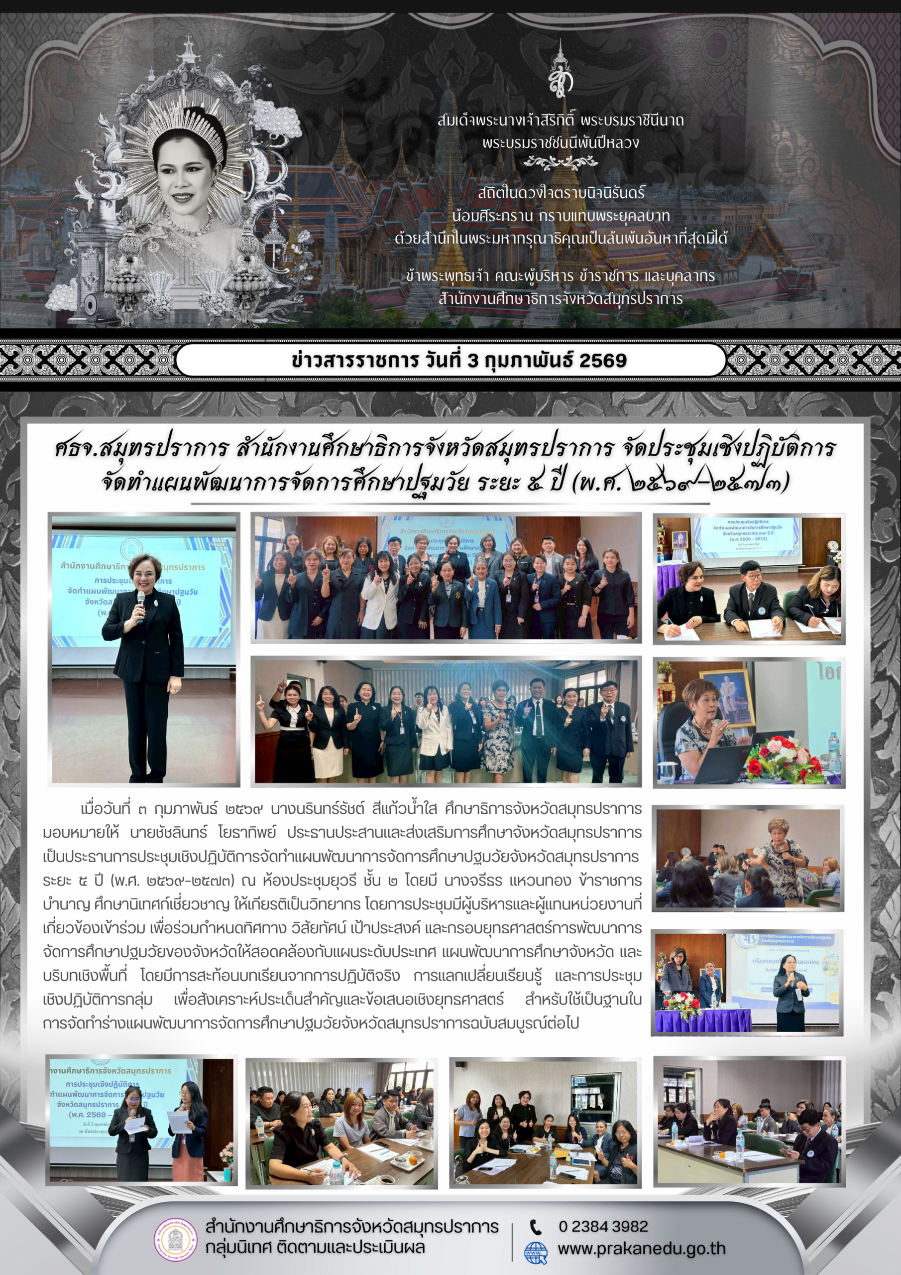 เมื่อวันที่ ๓ กุมภาพันธ์ ๒๕๖๙ นางนรินทร์รัชต์ สีแก้วน้ำใส ศึกษาธิการจังหวัดสมุทรปราการ มอบหมายให้ นายชัชลินทร์ โยธาทิพย์ ประธานประสานและส่งเสริมการศึกษาจังหวัดสมุทรปราการ เป็นประธานการประชุมเชิงปฏิบัติการจัดทำแผนพัฒนาการจัดการศึกษาปฐมวัยจังหวัดสมุทรปราการ ระยะ ๕ ปี (พ.ศ. ๒๕๖๙–๒๕๗๓) ณ ห้องประชุมยุวรี ชั้น ๒ โดยมี นางจรีธร แหวนทอง ข้าราชการบำนาญ ศึกษานิเทศก์เชี่ยวชาญ ให้เกียรติเป็นวิทยากร โดยการประชุมมีผู้บริหารและผู้แทนหน่วยงานที่เกี่ยวข้องเข้าร่วม เพื่อร่วมกำหนดทิศทาง วิสัยทัศน์ เป้าประสงค์ และกรอบยุทธศาสตร์การพัฒนาการจัดการศึกษาปฐมวัยของจังหวัดให้สอดคล้องกับแผนระดับประเทศ แผนพัฒนาการศึกษาจังหวัด และบริบทเชิงพื้นที่ โดยมีการสะท้อนบทเรียนจากการปฏิบัติจริง การแลกเปลี่ยนเรียนรู้ และการประชุมเชิงปฏิบัติการกลุ่ม เพื่อสังเคราะห์ประเด็นสำคัญและข้อเสนอเชิงยุทธศาสตร์ สำหรับใช้เป็นฐานใน การจัดทำร่างแผนพัฒนาการจัดการศึกษาปฐมวัยจังหวัดสมุทรปราการฉบับสมบูรณ์ต่อไป
