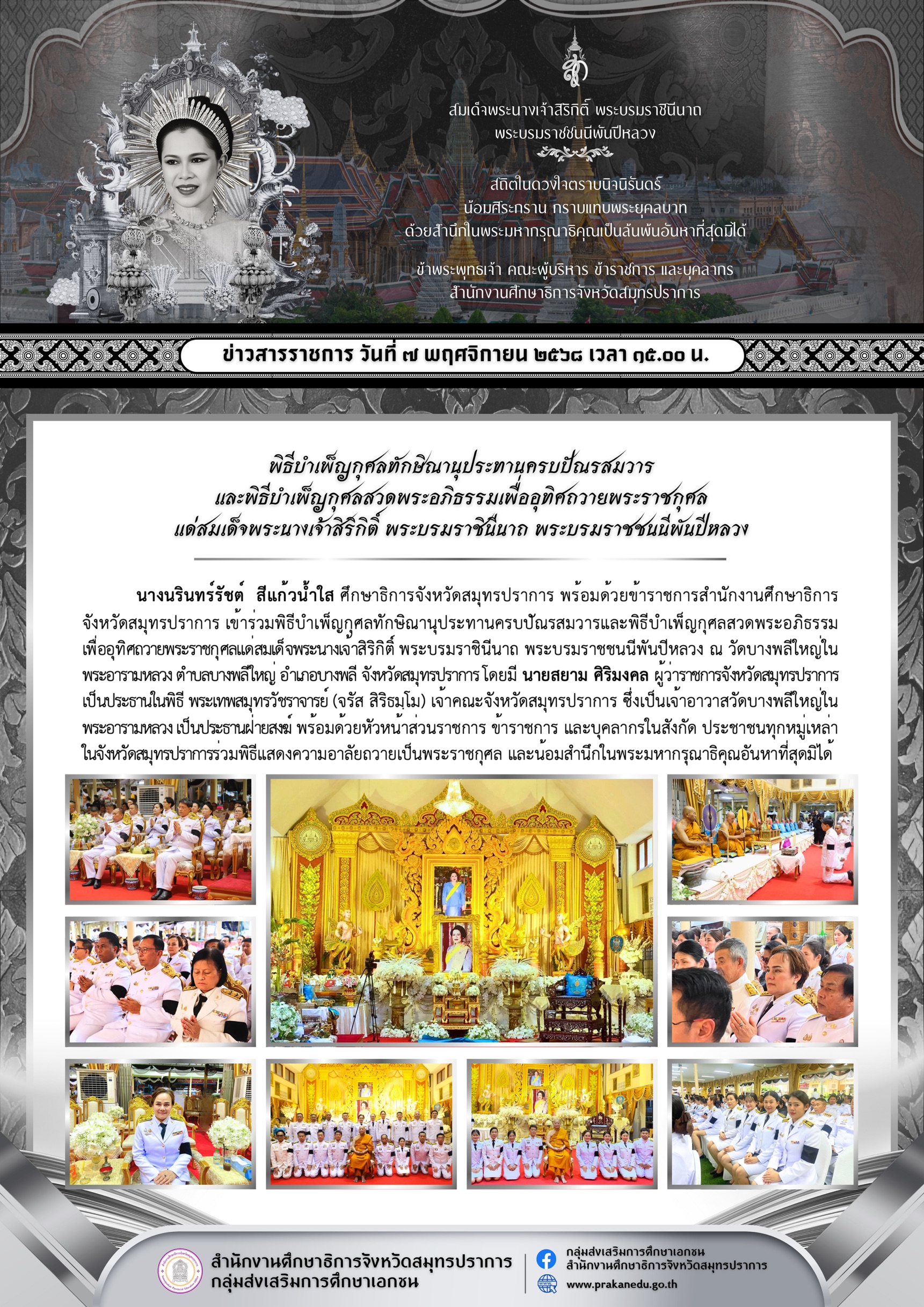 นางนรินทร์รัชต์ สีแก้วน้ำใส ศึกษาธิการจังหวัดสมุทรปราการ พร้อมด้วยข้าราชการสำนักงานศึกษาธิการจังหวัดสมุทรปราการ เข้าร่วมพิธีบำเพ็ญกุศลทักษิณานุประทานครบปัณรสมวารและพิธีบำเพ็ญกุศลสวดพระอภิธรรมเพื่ออุทิศถวายพระราชกุศลแด่สมเด็จพระนางเจ้าสิริกิติ์ พระบรมราชินีนาถ พระบรมราชชนนีพันปีหลวง ณ วัดบางพลีใหญ่ใน พระอารามหลวง ตำบลบางพลีใหญ่ อำเภอบางพลี จังหวัดสมุทรปราการ โดยมี นายสยาม ศิริมงคล ผู้ว่าราชการจังหวัดสมุทรปราการ เป็นประธานในพิธี พระเทพสมุทรวัชราจารย์ (จรัส สิริธมฺโม) เจ้าคณะจังหวัดสมุทรปราการ ซึ่งเป็นเจ้าอาวาสวัดบางพลีใหญ่ในพระอารามหลวง เป็นประธานฝ่ายสงฆ์ พร้อมด้วยหัวหน้าส่วนราชการ ข้าราชการ และบุคลากรในสังกัด ประชาชนทุกหมู่เหล่าในจังหวัดสมุทรปราการร่วมพิธีแสดงความอาลัยถวายเป็นพระราชกุศล และน้อมสำนึกในพระมหากรุณาธิคุณอันหาที่สุดมิได้