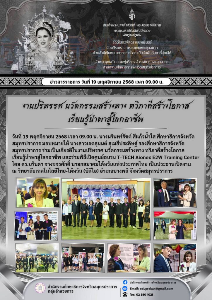 นางนรินทร์รัชต์ สีแก้วน้ำใส ศึกษาธิการจังหวัดสมุทรปราการ มอบหมายให้ นางสาวเจตสุมนต์ สุเมธีประดิษฐ์ รองศึกษาธิการจังหวัดสมุทรปราการ ร่วมเป็นเกียรติในงานปริทรรศ นวัตกรรมสร้างทาง ทวิภาคีสร้างโอกาสเรียนรู้นำพาสู่โลกอาชีพ และร่วมพิธีเปิดศูนย์อบรม T-TECH Aionex E2W Training Center โดย ดร.บรินดา จางขจรศักดิ์ นายกสมาคมไต้หวันแห่งประเทศไทย เป็นประธานเปิดงาน