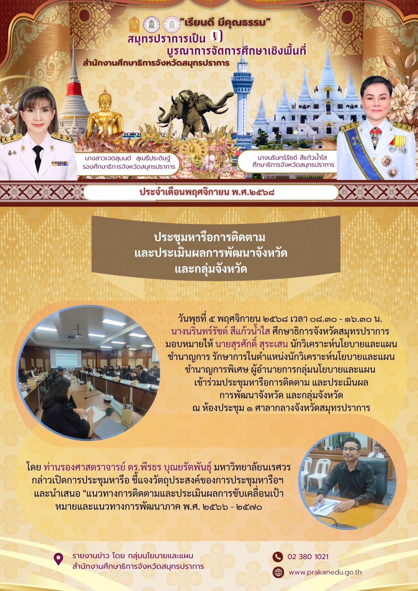 วันพุธที่ ๕ พฤศจิกายน ๒๕๖๘ เวลา ๐๘.๓๐ – ๑๖.๓๐ น. นางนรินทร์รัชต์ สีแก้วน้ำใสศึกษาธิการจังหวัดสมุทรปราการ มอบหมายให้ นายสุรศักดิ์ สุระเสน นักวิเคราะห์นโยบายและแผน ชำนาญการรักษาการในตำแหน่งนักวิเคราะห์นโยบายและแผน ชำนาญการพิเศษผู้อำนายการกลุ่มนโยบายและแผน เข้าร่วมประชุมหารือการติดตามและประเมินผลการพัฒนาจังหวัด และกลุ่มจังหวัด ณ ห้องประชุม ๑ ศาลากลางจังหวัดสมุทรปราการ โดย ท่านรองศาสตราจารย์ ดร.พีรธร บุณยรัตพันธุ์ มหาวิทยาลัยนเรศวร กล่าวเปิดการประชุมหารือ ชี้แจงวัตถุประสงค์ของการประชุมหารือฯ และนำเสนอ “แนวทางการติดตามและประเมินผลการขับเคลื่อนเป้าหมายและแนวทางการพัฒนาภาค พ.ศ. ๒๕๖๖ – ๒๕๗๐