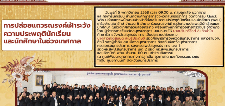 กลุ่มลูกเสือ ยุวกาชาดและกิจการนักเรียน สำนักงานศึกษาธิการจังหวัดสมุทรปราการ จัดกิจกรรม Quick Win ปล่อยแถวพนักงานเจ้าหน้าที่ส่งเสริมความประพฤตินักเรียนและนักศึกษา (พสน.) เครือข่ายเสมารักษ์